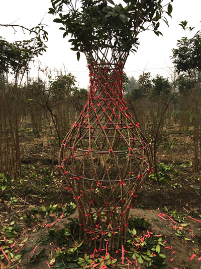 三、捆扎造型。造型時,可按花瓶規(guī)定的樣式和規(guī)格進行。在編排枝條之前需用竹條或者鐵絲做成不同規(guī)格的圓圈。編排時,先將圓圈固定在枝條中間做花瓶的骨架,之后將紫薇枝條由下至上編排,每個枝條的交叉點用繩子捆牢,每個交叉孔應絕對規(guī)則統(tǒng)一,大小一致,錯落有序。由于紫薇再生能力很強,捆扎緊貼,每個交叉捆扎點一般在12-16個月就能長到一起。